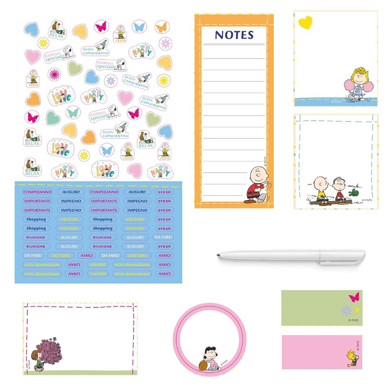 Dai un tocco di colore e di personalità alla tua casa e tieni sotto controllo gli impegni di tutto l’anno accompagnato dai simpatici Peanuts. Calendario agenda 14 mesi + Penna + Block notes + Stickers + Foglietti adesivi.